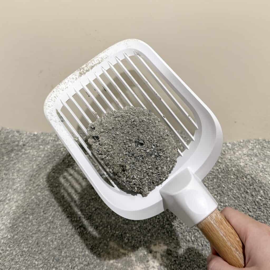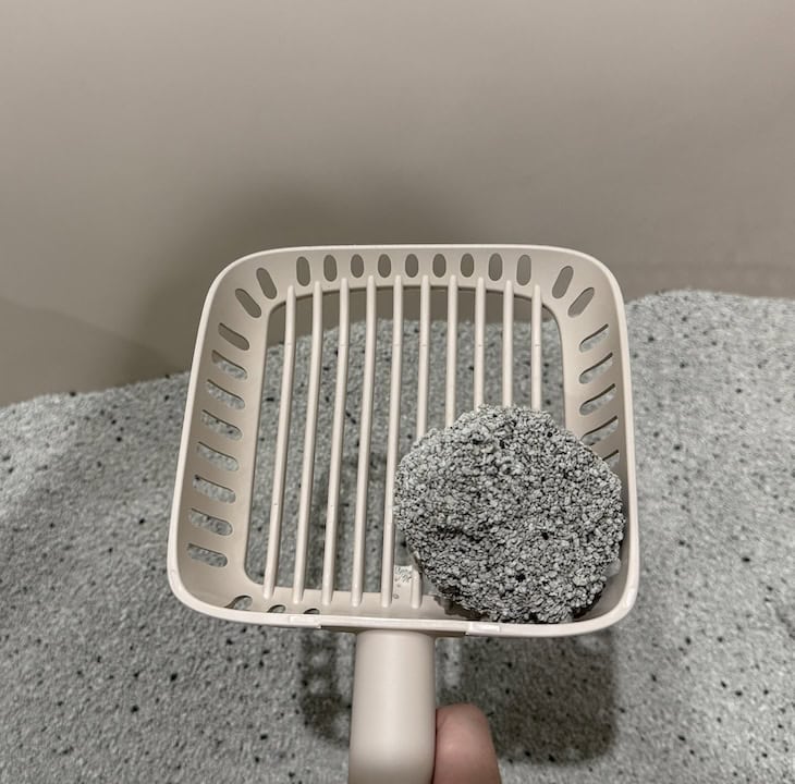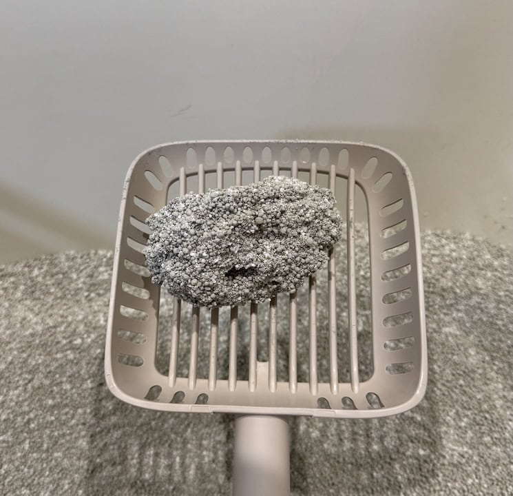 這款是唯一我用一周左右就聞到明顯臭味的品牌,因為不像貓尿阿摩尼亞臭味,我還上chatGPT搜尋,可能是使用礦石處理過程導致,雖然標示無香精,但一鏟就有刺鼻味且凝結不穩定,有時候能成團有時又會崩開。