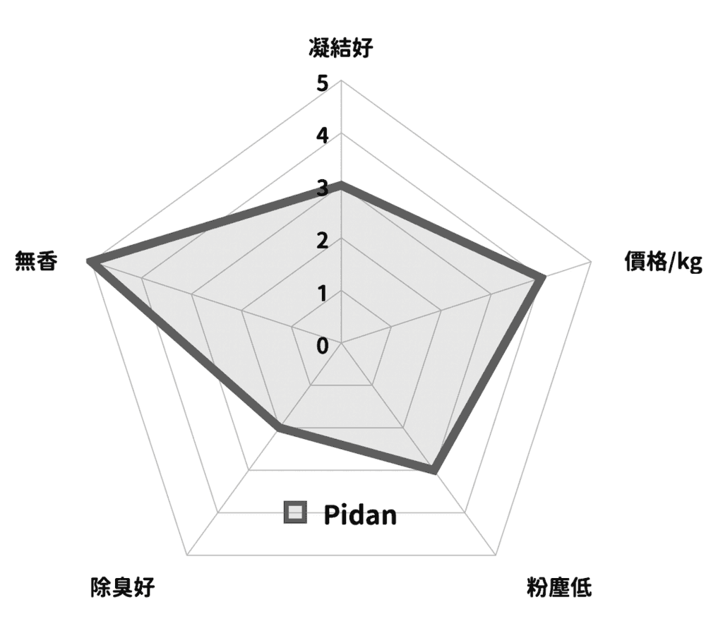 和喵皇奴顆粒與成分最相近的品牌,用久有點容易受潮,除臭效果雖然沒辦法像喵皇奴這麼持久但已經不錯,可惜尿塊呈現不規則狀,邊緣還是會崩,包裝有蓋子個人覺得垃圾量體積比較大,整體表現還不錯。